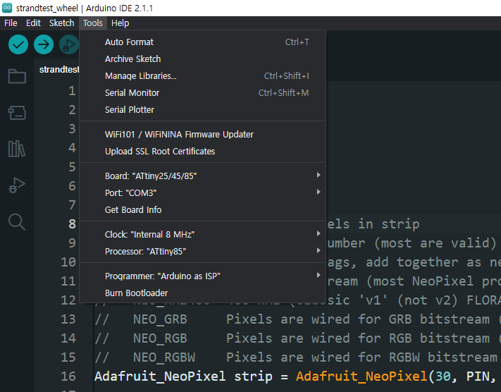 이제 모든 준비가 끝났다. 원하는 코드를 입력하고 업로드 하면 ATtiny에 프로그램이 업로드 된다.