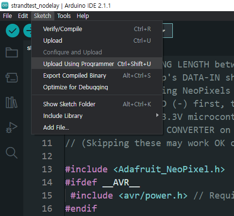 Arduino IDE 2.0 부터는 프로그래머를 이용한 업로드 방법이 바뀌었다. Arduino 1.X처럼 그냥 Upload 하면 A programmer is required to upload. 라는 에러 메세지가 나온다.