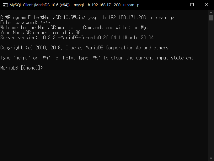MariaDB(MySQL) 클라이언트를 실행하고 아래와 같이 입력한다.