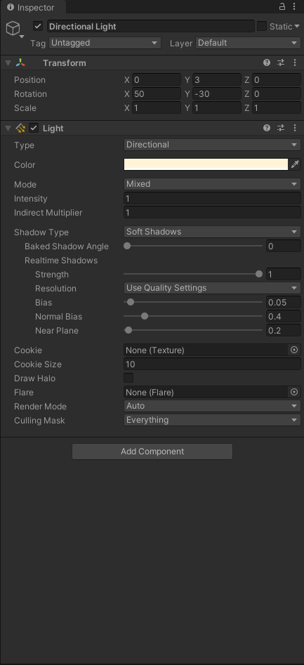 유니티 3D를 실행하면 Directional Light가 하나 추가 되어 있다.