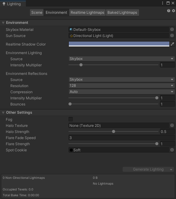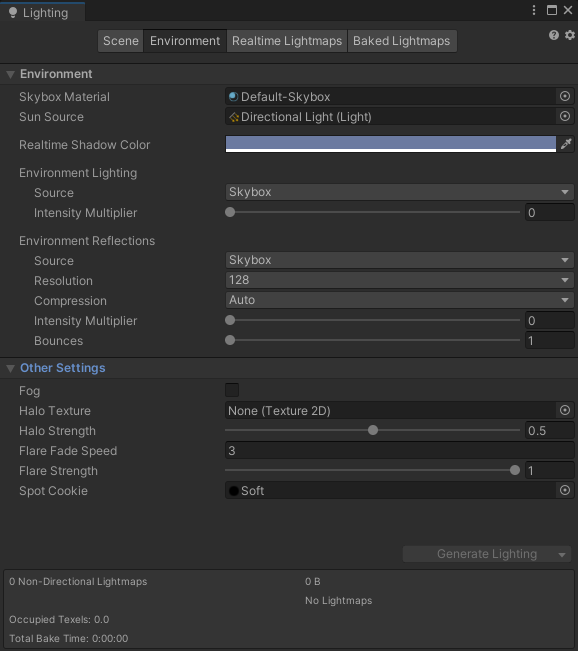 그 외, Skybox Material등의 설정도 바꿀 수 있다.