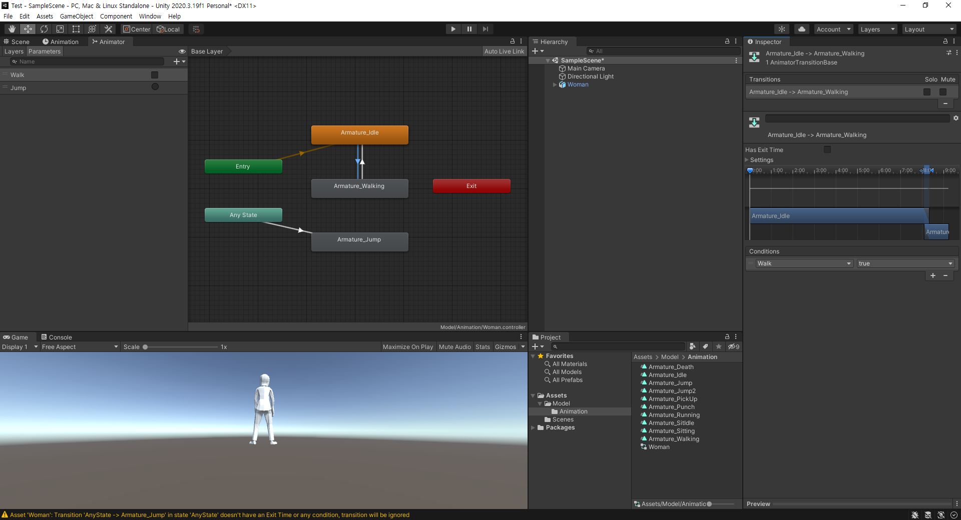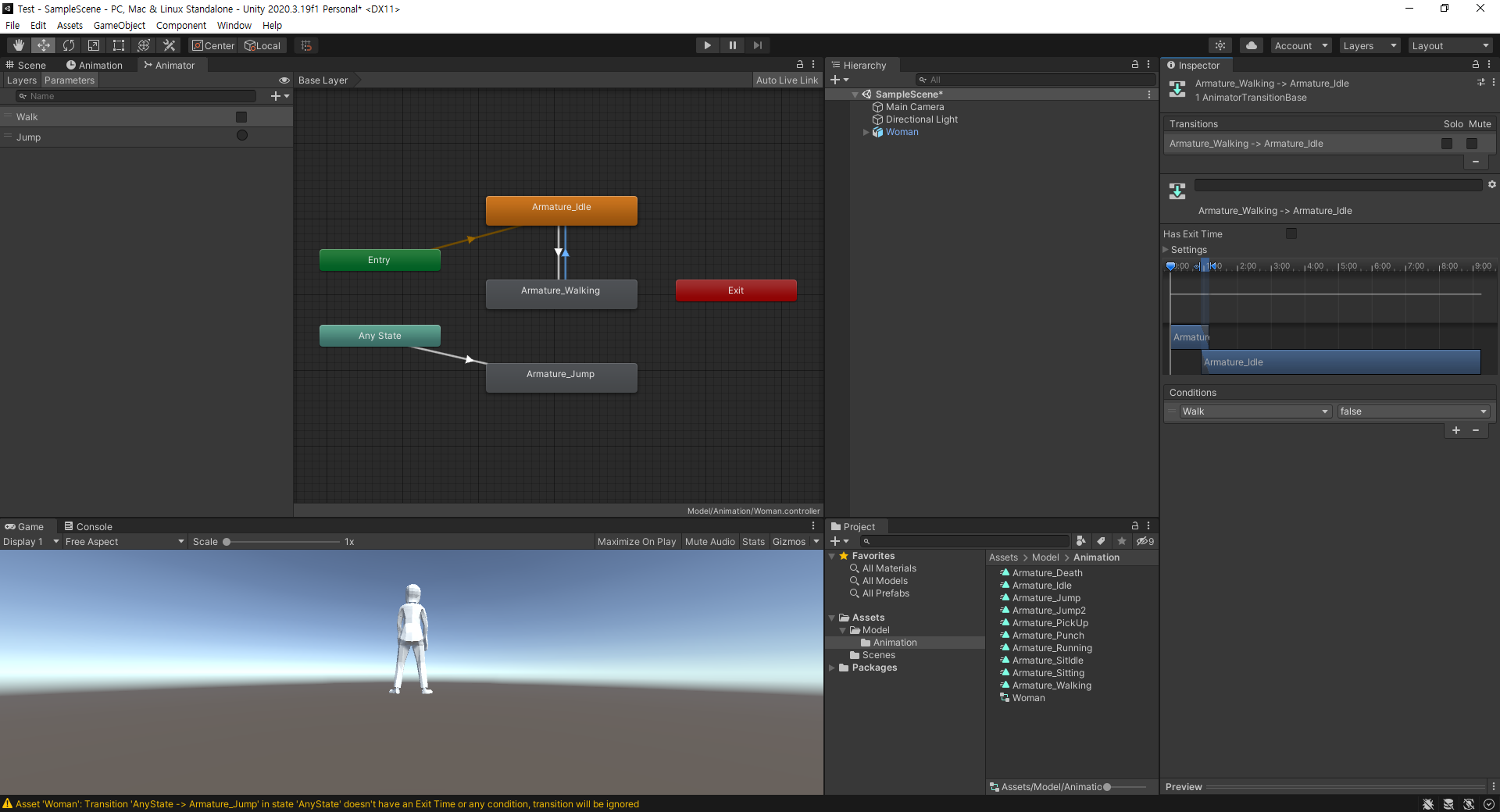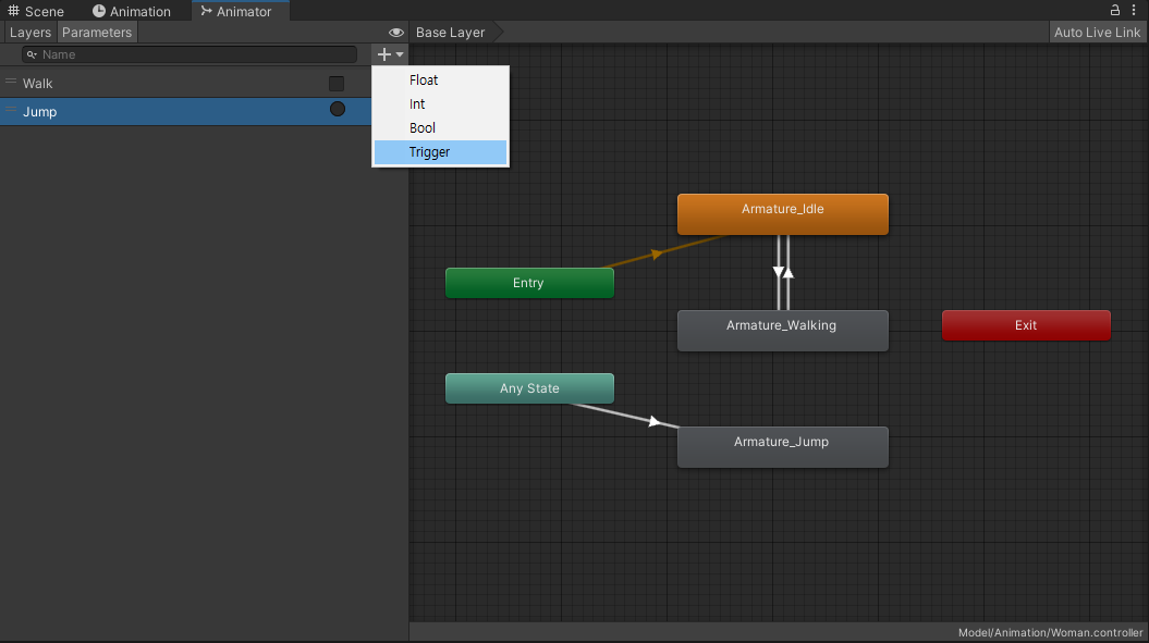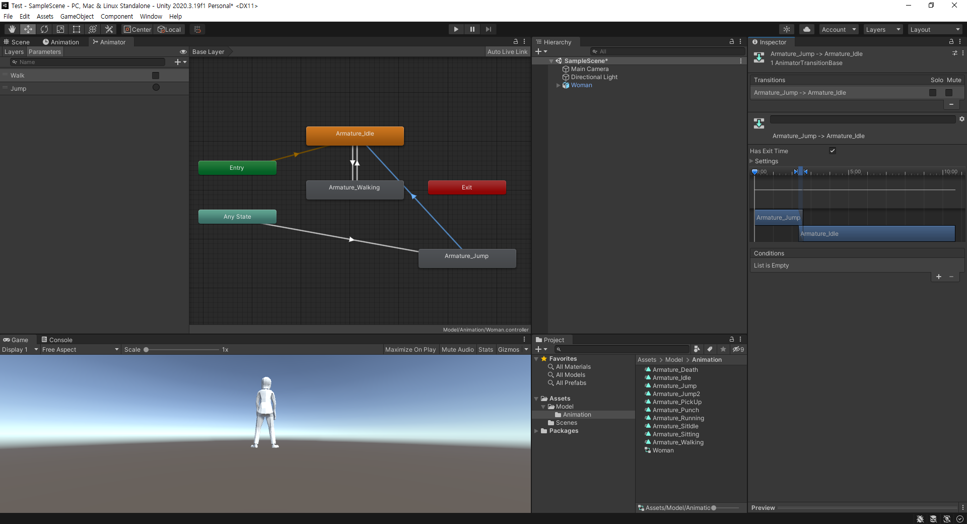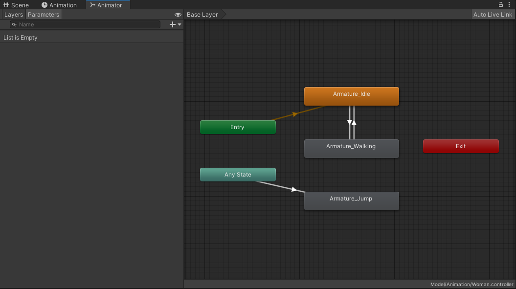 이 상태에서 실행해 보면 Idle, Walk는 생각대로 작동하지만 Jump 후 다시 Idle이나 Walk로 돌아가지 못한다.
