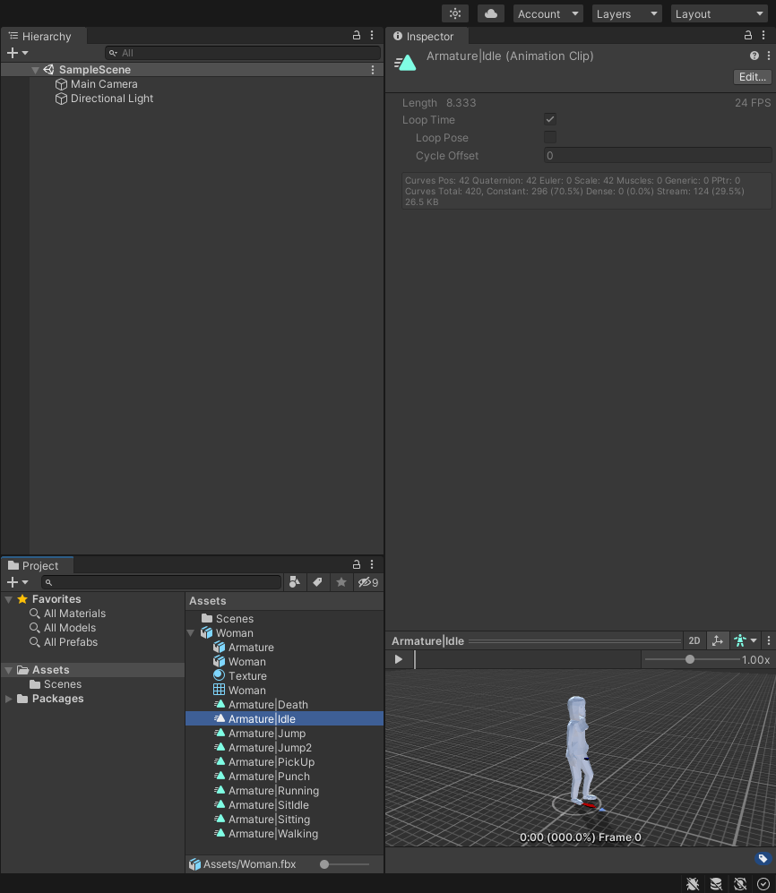 모델에 포함된 애니메이션도 인스펙터 창에서 직접 수정 할 수 있다.