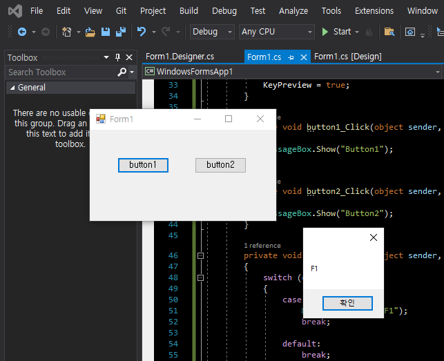 버튼이나 다른 컨트롤이 있는 폼에서 특정 키를 눌렀을때 원하는 동작을 하게 하기 위해 Form KeyDown 이벤트 핸들러를 작성해도 포커스를 갖고 있는 컨트롤이 먼저 키 이벤트를 처리하기 때문에 원하는 동작을 처리할 수 없다.