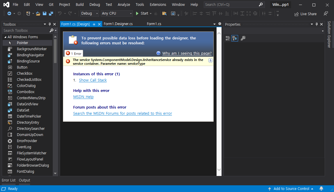 The service System.Windows.Forms.Design.ISelectionUIService already exists in the service container. Parameter name: serviceType