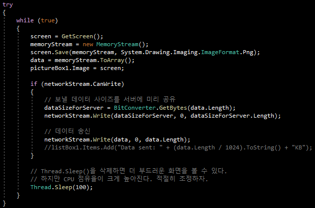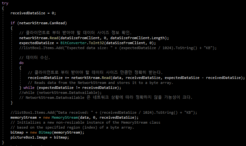 작은 크기의 데이터는 사이즈 정보 교환없이 한번에 송수신해도 별 문제는 없다. 하지만 이 프로그램처럼 수백 KB의 데이터를 주고 받는 경우 한번에 송수신이 되지 않을 가능성이 크다.