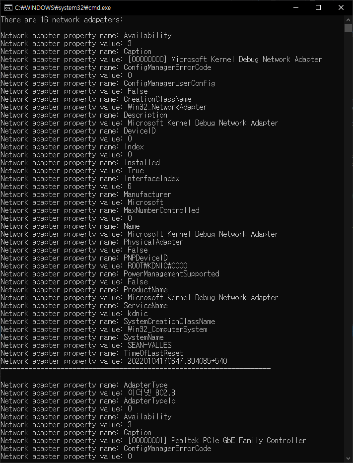 WMI(Windows Management Instrumentation)를 이용해 컴퓨터의 모든 네트워크 어댑터를 확인해 보자.