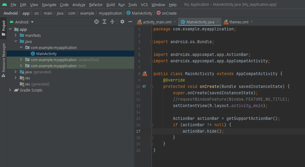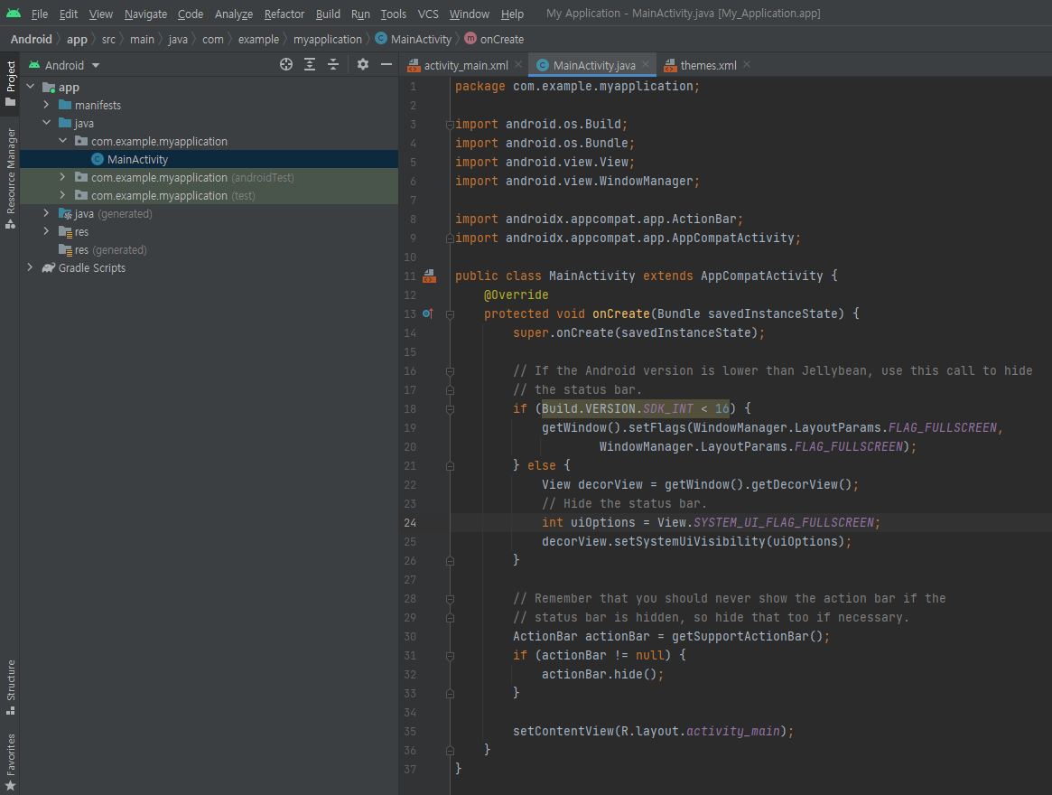 상태 표시줄을 숨기면 액션바도 보이지 않게 해야한다. (바로 위 예에서는 상태 표시줄만 숨겼지만 별 문제는 없어 보였다. 정확히 어떤 문제가 있는지는 잘 모르겠다. 이 예에서도 actionBar.hide()를 주석처리해도 별 문제는 없다)
