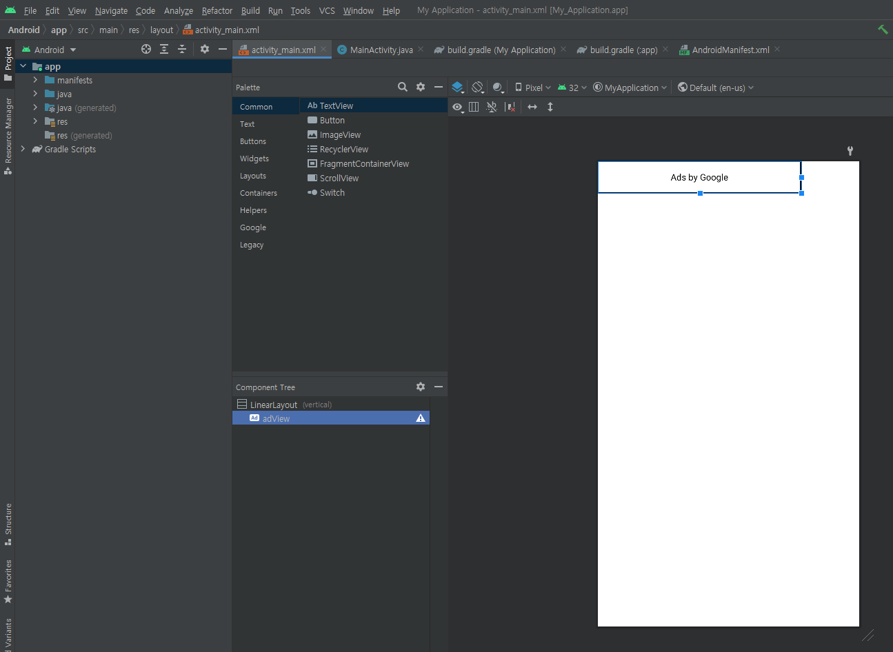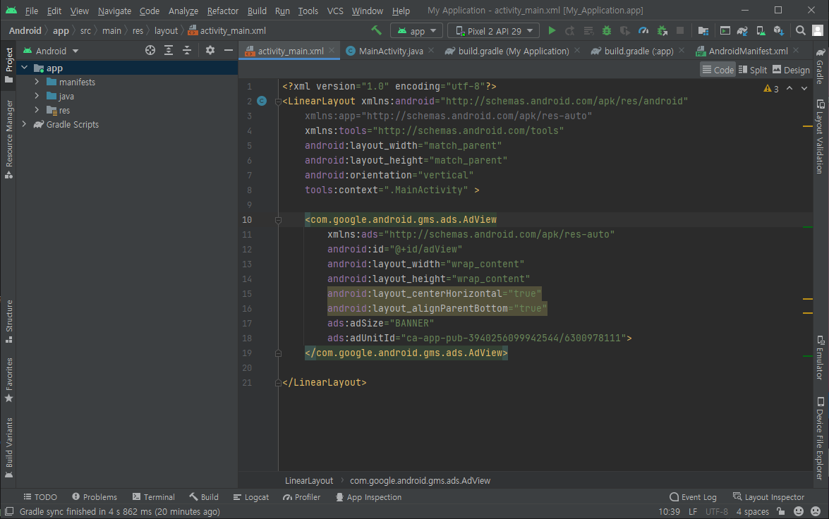adView 옆의 경고(!)는 레이아웃과 뷰세팅값의 불일치로 나타나는 경고로, 간단히 수정 가능하다.