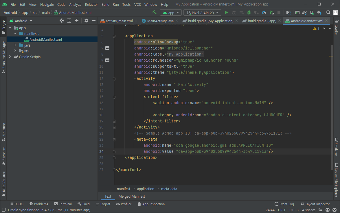 실제 앱에서는 위에 표시된 앱 ID가 아닌 실제 AdMob 앱 ID를 사용한다.