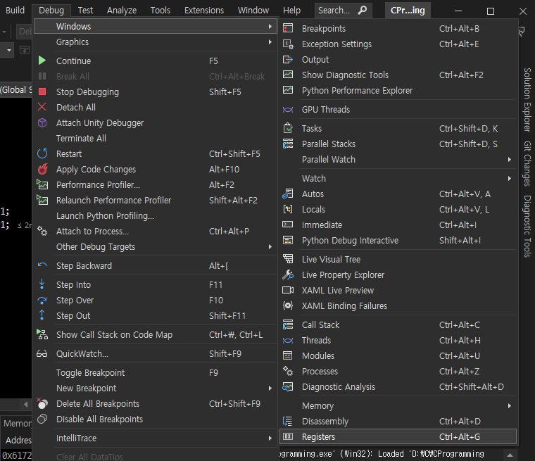 디버깅시 레지스터 윈도우가 뜨지 않는다면 아래와 같이 설정을 변경한다.