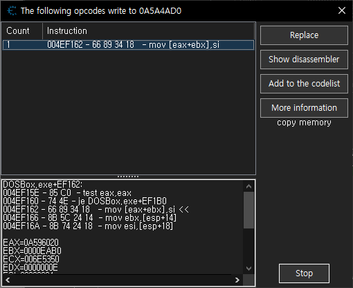 Reverse Engineering 2023. 1. 26. 22:35 |치트 엔진으로 게임에서 수정하고 싶은 값의 주소를 찾아도 게임을 다시 실행시키면 그 주소가 변경되어 처음부터 다시 진행해야만 하는 경우가 있다.(포인터 등으로 해결 불가) 예를 들어 도스박스로 고전 게임을 실행시키는 경우 값의 주소가 변경될 뿐만 아니라 그 값을 기록하는 명령이 다른 여러 주소에 접근하기 때문에 쉽게 에디터를 만들 수가 없다.