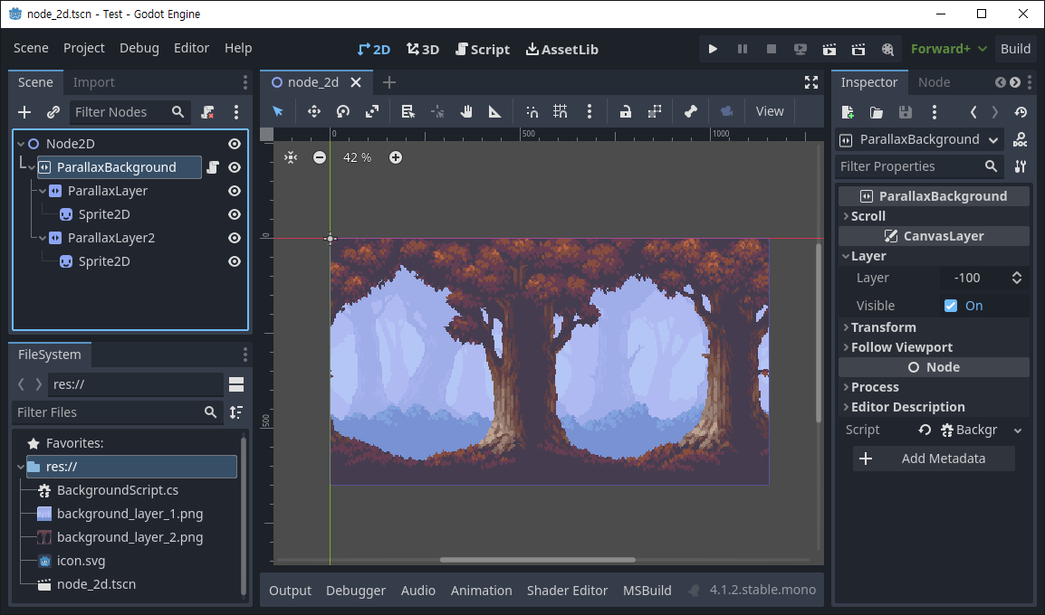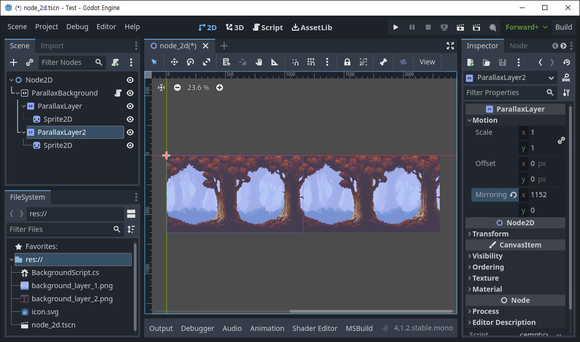 ● ParallaxBackground - 두 개의 ParallaxLayer를 자식 노드로 생성하고 스크립트를 추가한다.