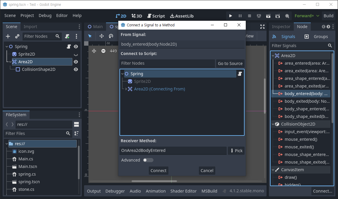spring.cs의 OnArea2dBodyEntered()를 위와 같이 바꾸면 SetDeferred()를 사용할 때 보다 훨씬 반응이 빠르고 자연스러운 파동이 만들어진다.