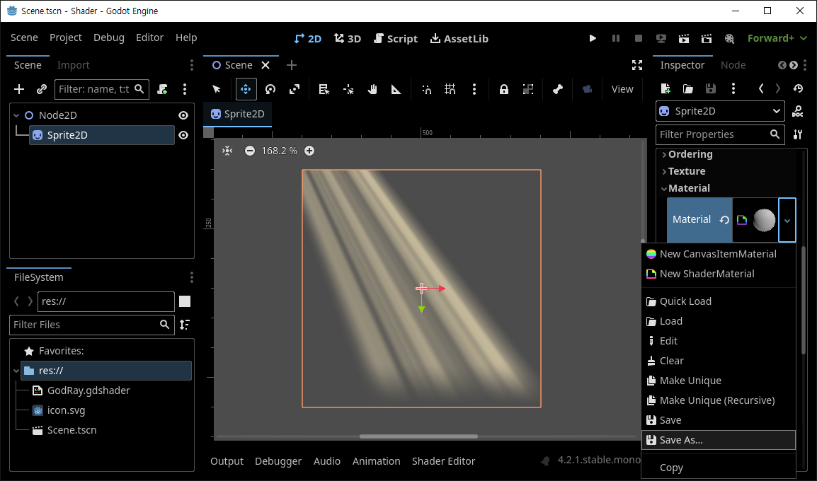 Shader 파일(GodRay.gdshader)에 위와 같은 코드를 작성한다.
