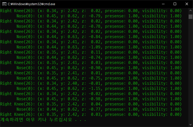 print("Right Knee(26): (x: %.2f, y: %.2f, z: %5.2f, presense: %.2f, visibility: %.2f)"