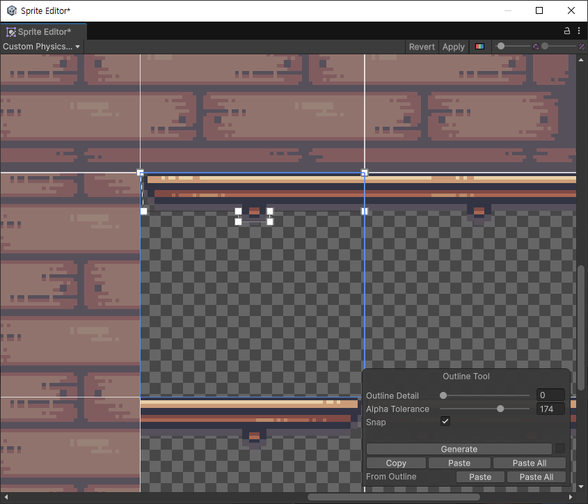 스프라이트를 임포트하면 Inspector - Sprite Mode - Generate Physics Shape 설정을 체크해서 Physics Shape 설정을 하지 않은 스프라이트에 대해 기본 Physics Shape을 생성하게 할 수 있다. 하지만 이 설정은 shape이 임의로 정해진다.