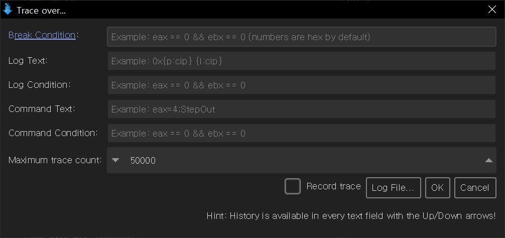 Trace into/over는 step into/over를 Maximum trace count에 지정된 숫자만큼 자동으로 진행하는 것이다. 예를 들어 Log Text에 eax: {eax}를 입력하고 Maximum trace count에 2를 입력한 후 OK를 클릭하면 Log 창에 아래와 같은 기록이 남는다.
