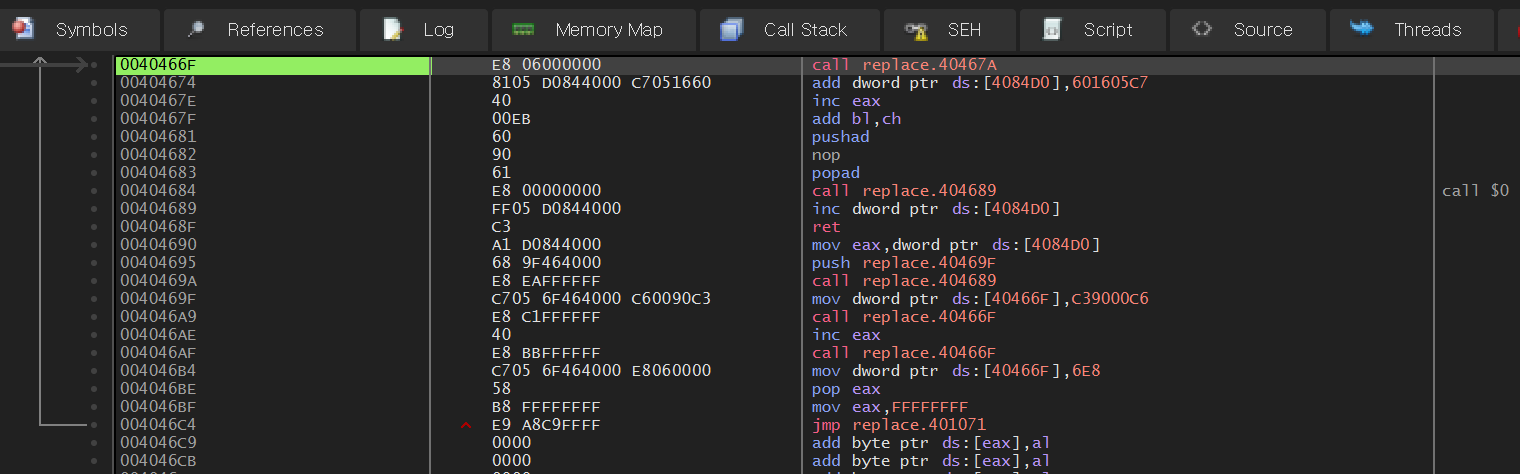 0040466F 에서 call replace.40467A 명령어가 실행되면 00404674 주소에 있는 명령의 중간부터 다시 해석되어 아래와 같이 명령이 바뀐다.