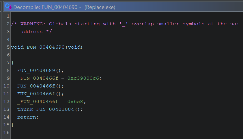 두 개의 노란색 코드를 보면 _FUN_0040466f()를 덮어 쓰고 있다. 이 경우 함수의 내용이 바뀌게 된다. 그래서 경고를 하는거 같다.