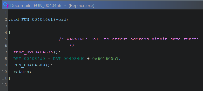 FUN_0040466f() 의 첫 번째 명령이 CALL LAB_00404674+6(0040467a) 이다. 잘 살펴보면 0040467a 라는 주소는 바로 아래 명령의 중간 부분이다. 뭔가 이상해서 첫 번째 그림에서와 같이 0040467a 호출 명령은 다른 함수들과 달리 소문자로 주석과 같은 분홍색으로 표시되는거 같다.