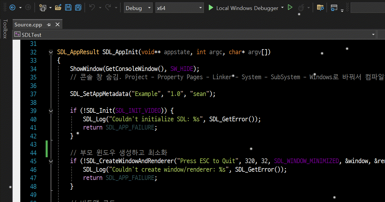 // 콘솔 창 숨김. Project - Property Pages - Linker - System - SubSystem - Windows로 바꿔서 컴파일해도 된다.