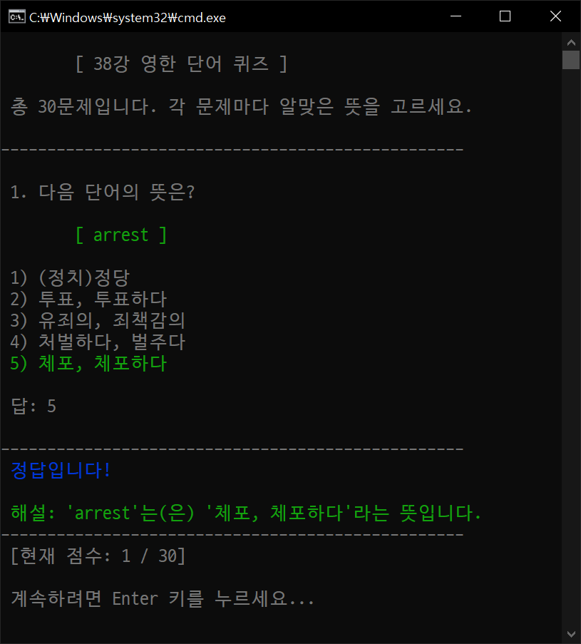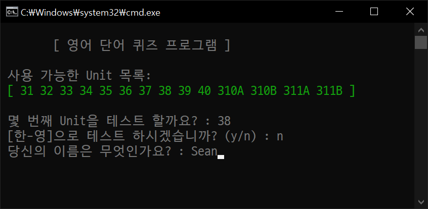 print(f"\n\t[ 영어 단어 퀴즈 프로그램 ]")