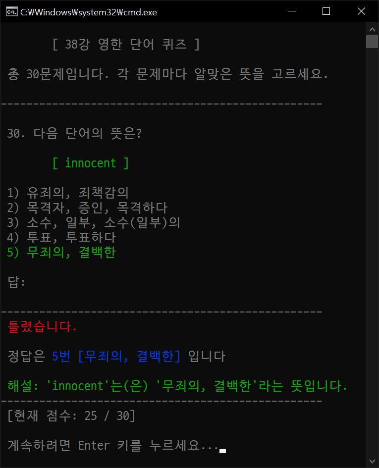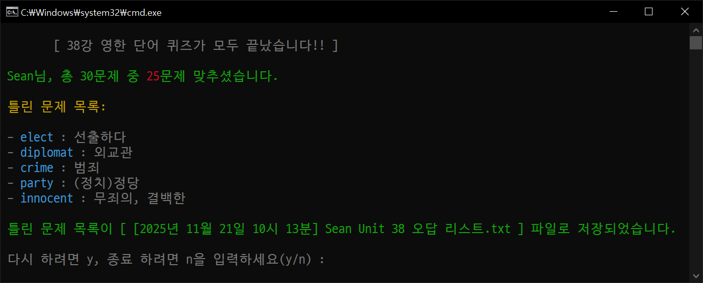 reverse = input(" [한-영]으로 테스트 하시겠습니까? (y/n) : ")