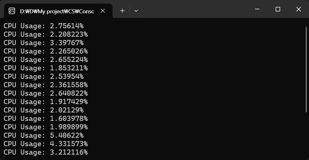 Console.WriteLine("CPU Usage: {0}%", cpuPercent);