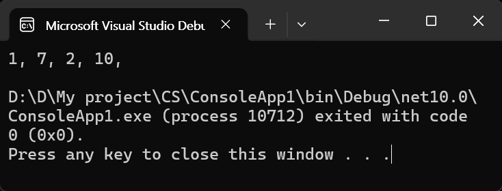 foreach (int i in numbersArray[2..^5]) // '^'는 뒤에서 부터 인덱싱. ^5는 파이썬의 -5와 동일.