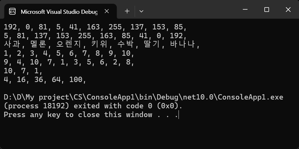 List<string> fruits = new List<string> { "사과", "바나나", "딸기", "오렌지", "수박", "멜론", "키위" };
