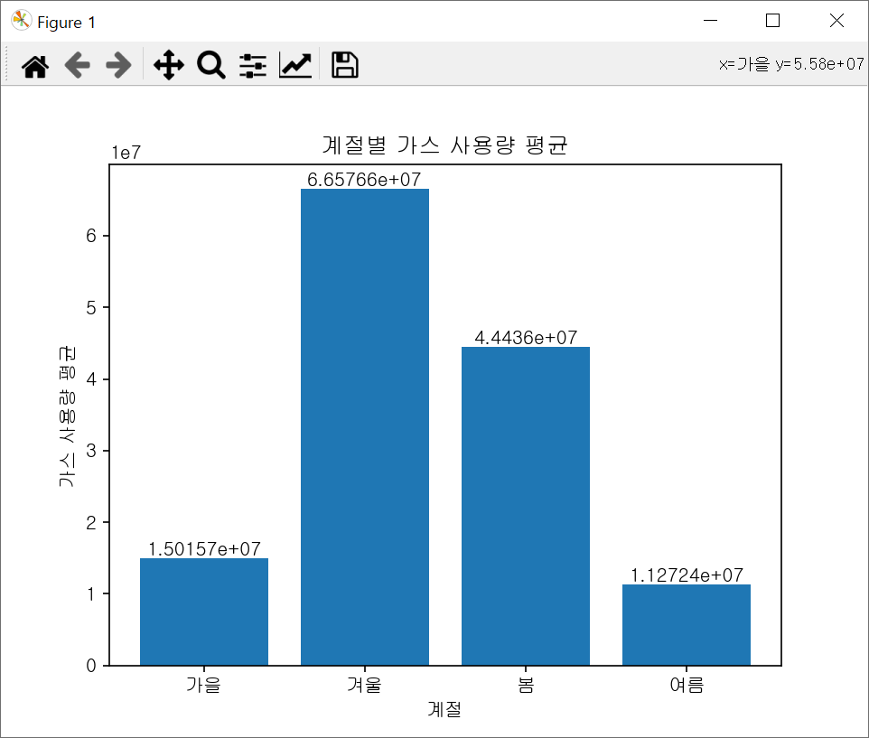 3-2. 계절별 가스 사용량 평균을 막대 그래프로 시각화 하고 각 막대의 수치를 표시하자.
