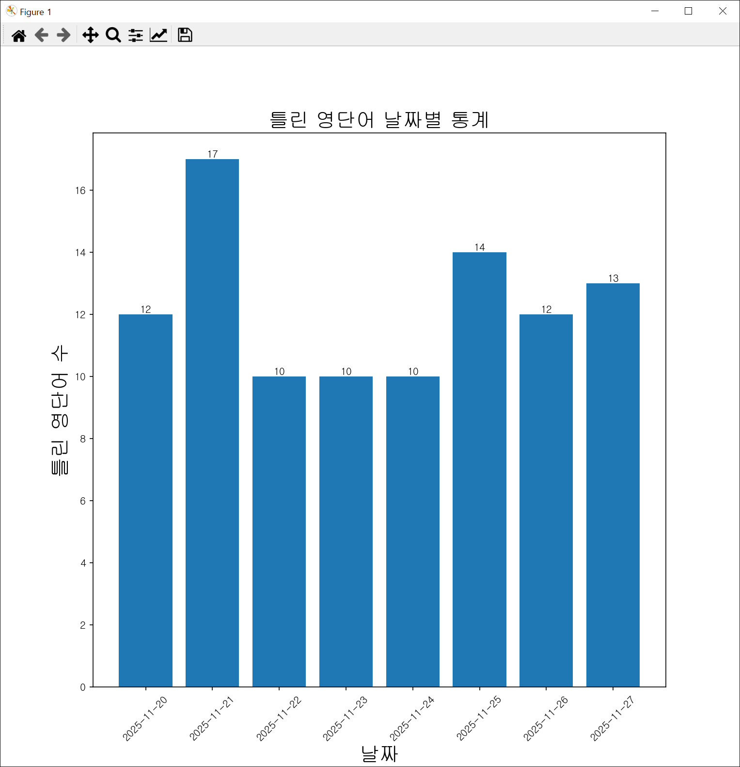 answer = input("\n 틀린 영단어 날짜별 통계를 시각화 하시겠습니까? (y/n): ")