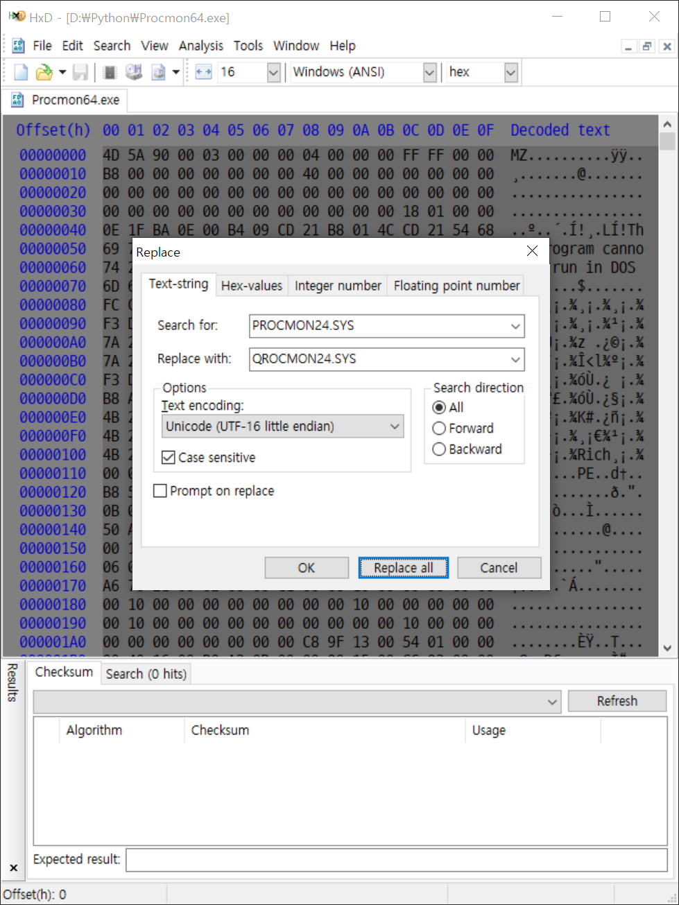 위 방법은 경고창이 뜨는건 해결하지만 계속해서 Process Monitor를 사용하기는 불편하다. Themida가 Process Monitor를 검색하지 못하도록 아래와 같은 세 가지 Process Monitor 내부의 유니코드(UTF-16) 문자열을 다른 문자로 바꿔보자.