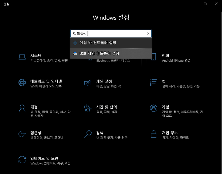 Windows 설정에서 컨트롤러를 검색한다. USB 게임 컨트롤러 설정이 표시 되면 선택 한다.