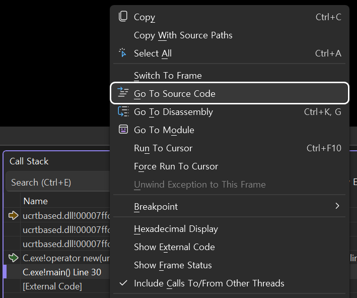 Call Stack 윈도우에서 현재 위치 아래에 있는 내가 작성한 파일로 판단되는 위치에서 우클릭한다.