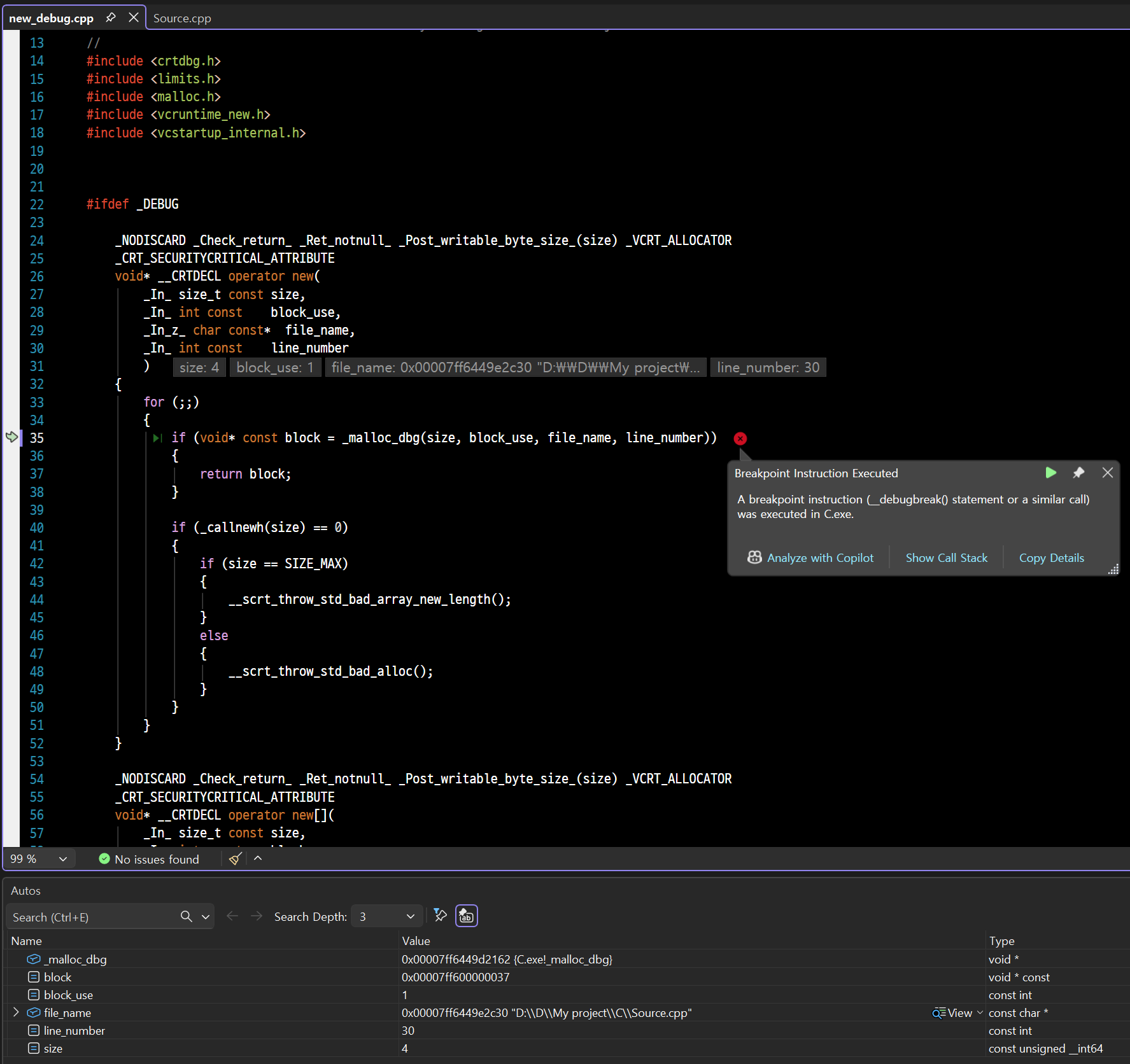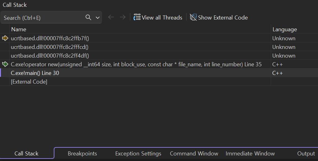 _CrtSetBreakAlloc()가 동작하여 디버거가 멈출 때, 내가 작성한 소스 코드가 아닌 new_debug.cpp 같은 알 수 없는 파일에서 멈추는 이유는 new나 malloc을 호출했을 때 실제 메모리를 할당하는 C++ 런타임 라이브러리(CRT)의 최하단 내부 코드에서 브레이크가 걸리기 때문이다.