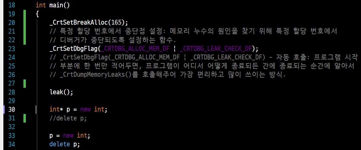 // _CrtDumpMemoryLeaks() - 수동 호출: 원하는 특정 시점의 누수를 바로바로 검사하고 싶을 때 유용.