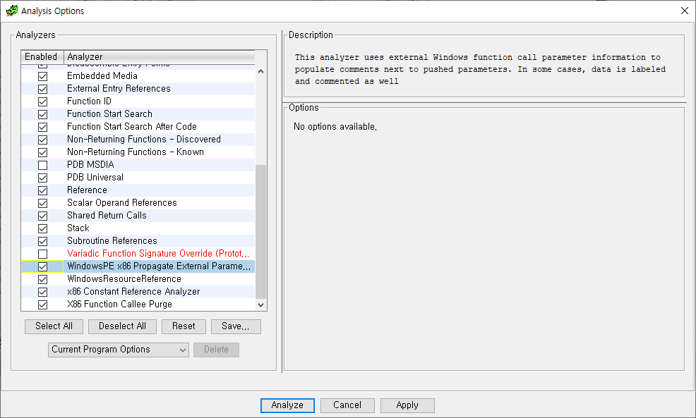 WindowsPE x86 Propagate External Parame... 옵션을 선택하고 분석한다.