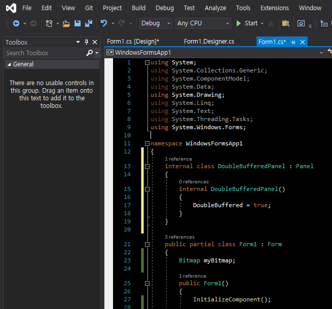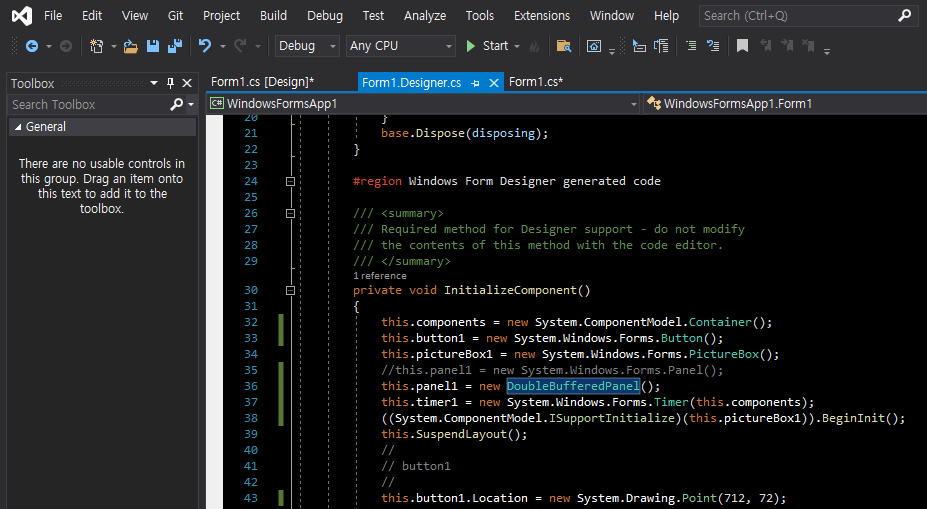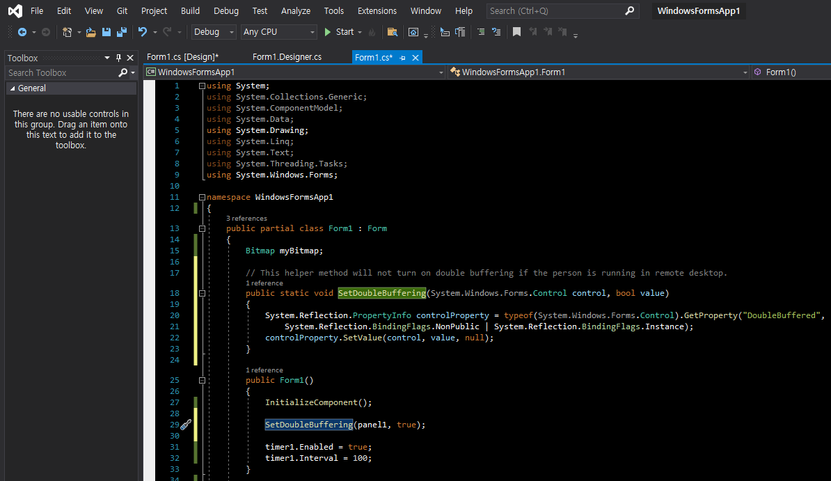 C# 2021. 12. 3. 23:15 |C# 폼 디자이너에서 폼은 더블 버퍼링 속성을 적용할 수 있지만 대부분의 컨트롤은 더블 버퍼링 속성이 보이지 않는다.