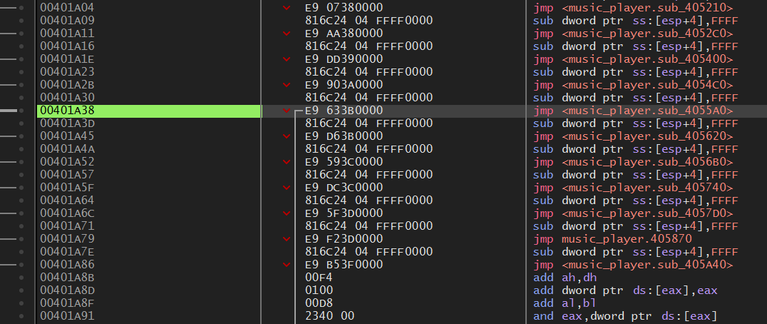 Step Into로 한 스텝 들어가 보면 여러 함수의 목록 테이블 같은 코드로 이동하게 된다. 그 중 00401A38은 4055A0로 이동하는 jmp명령이다.