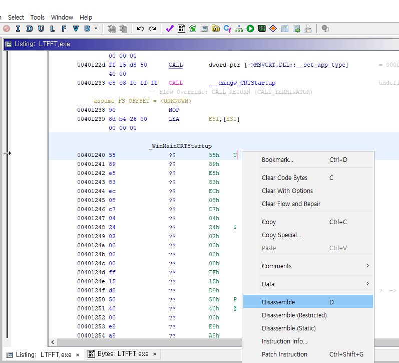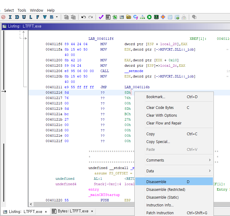 Disassemble(Restricted), Disassemble(Static)은 한 줄(혹은 블럭으로 지정된 부분)만 디스어셈블한다.