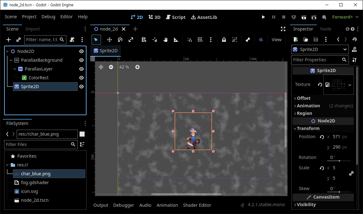 Sprite2D - 캐릭터 스프라이트를 추가하고 화면 중앙에 위치시킨다.