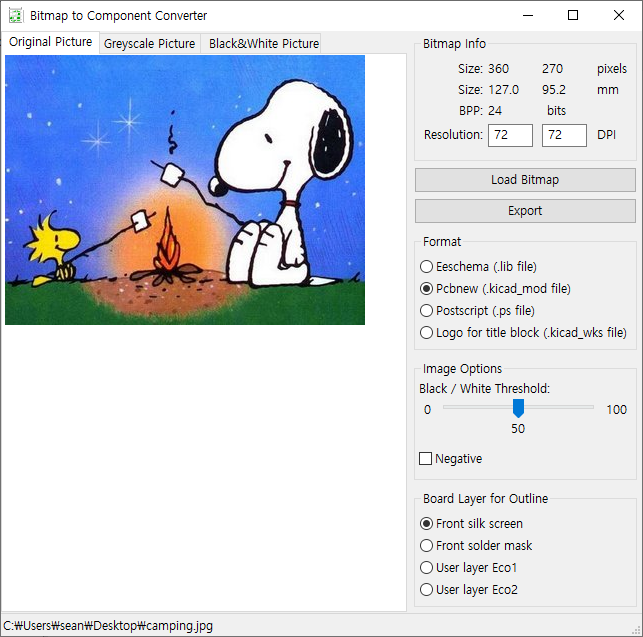 이미지 선택이 완료 되었으면 Export를 클릭하고 적당한 폴더에 Pcbnew 파일을 만든다.