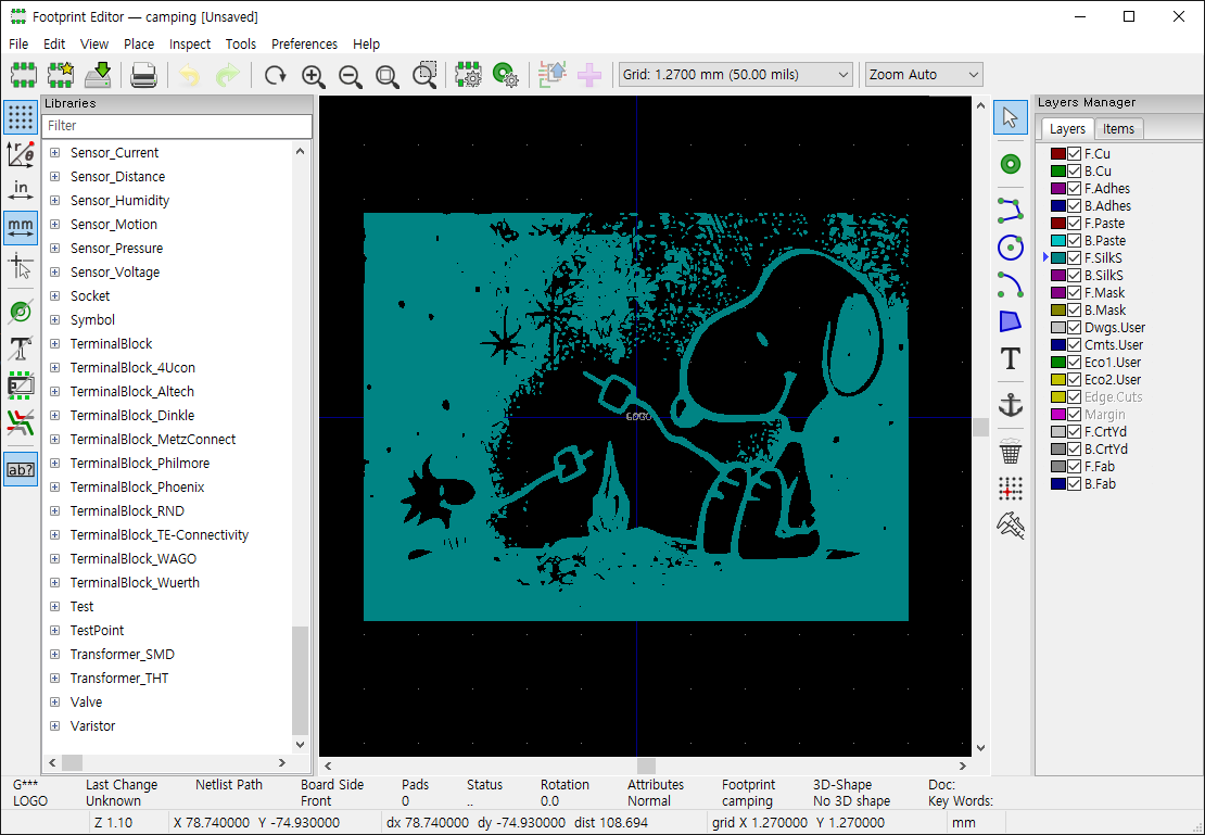 CAD 2021. 8. 23. 19:45 |KiCad에는 PCB에 로고(그림)를 넣는 메뉴가 없다. 직선과 원만으로 로고를 그리기는 어려우므로 아래 방법을 사용한다.