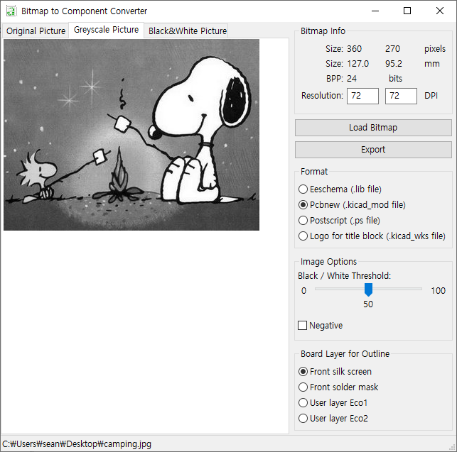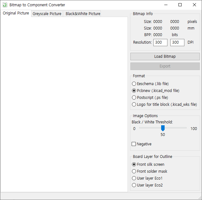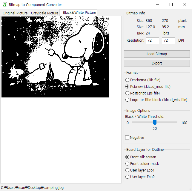 PCB위에 silk screen으로 적용하는 경우 결과는 Black&White Picture와 거의 같다. Picture가 마음에 들지 않는다면 원본 파일을 적당히 전처리 해 준다. 이미지가 너무 크거나 작다면 미리 사이즈를 수정해야 할 수도 있다. 상단의 Bitmap Info와 Image Options의 Black/White Threshold를 확인하자.