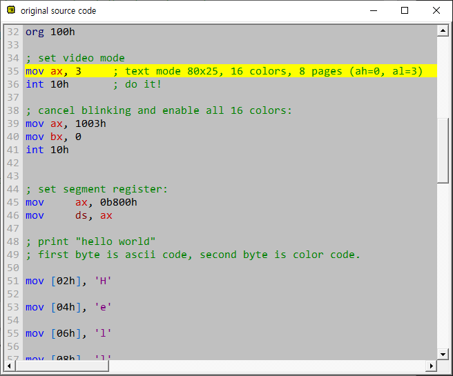 에뮬레이트할 소스 코드를 보여주는 창. 첫 번째 명령어에서 실행 대기 상태가 된다.