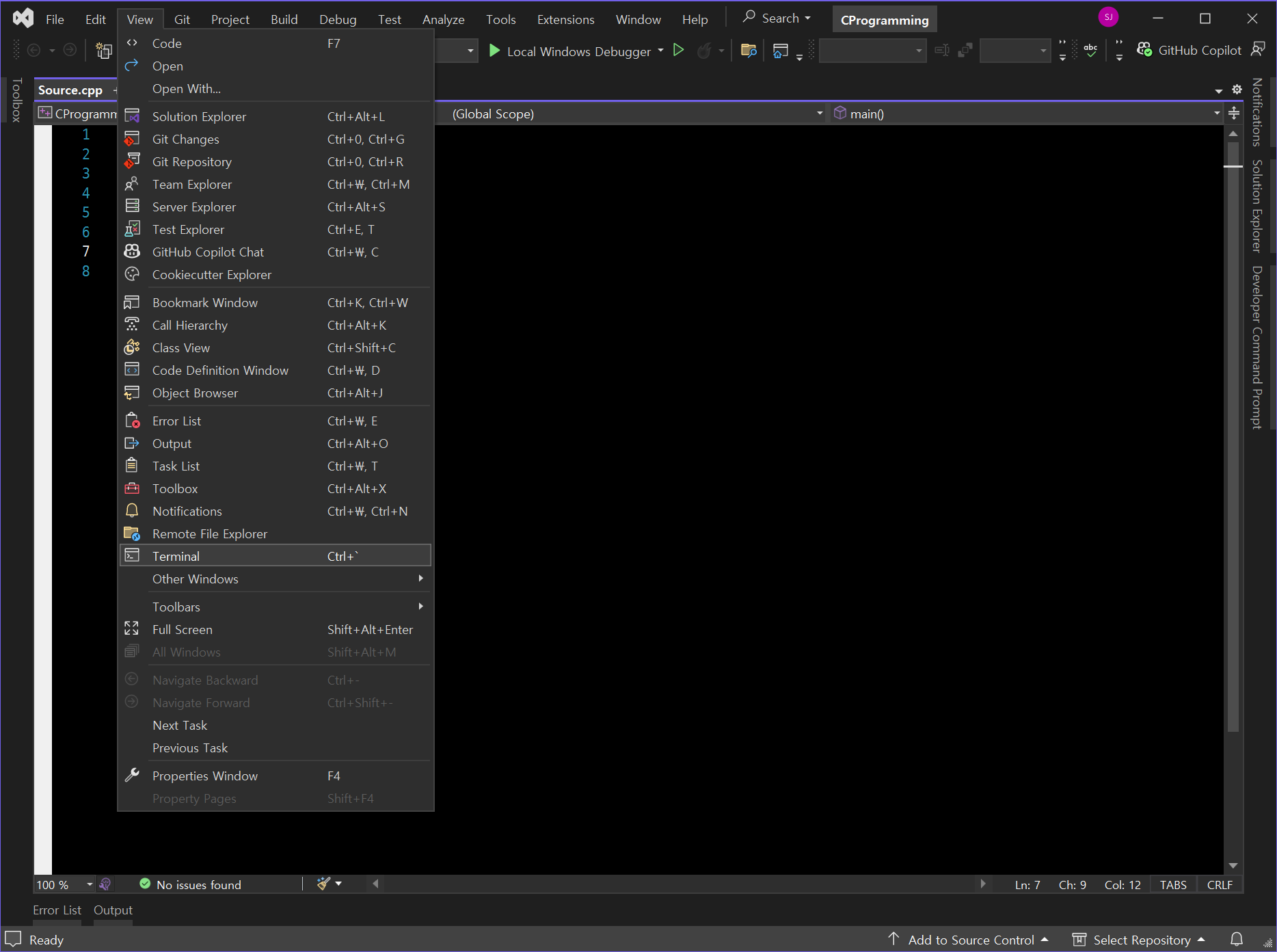 General 2025. 11. 25. 14:51 |Visual Studio를 사용하다 터미널(콘솔) 창을 열어야 할 경우가 있다. Window+R - cmd 명령을 실행해 작업 경로로 이동해도 되지만 Visual Studio에서 바로 작업 경로 터미널 창을 열 수 있다.