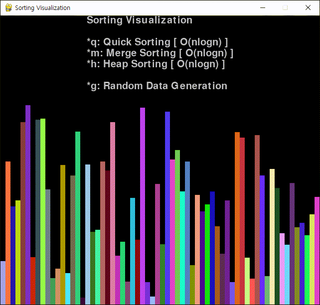 기본 정렬 알고리즘 세 가지(퀵, 머지, 힙)를 파이게임(Pygame)으로 시각화 해 보자.